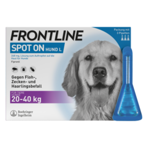 Frontline® Spot on Hund S, M, L, Lösung zum Auftropfen auf die Haut, für Hunde// Frontline® Spot on Katze, Lösung zum Auftropfen auf die Haut, für Katzen. Anwendungsgebiete: Zur Behandlung von Hunden mit einem Körpergewicht von 2 kg bis 10 kg (S), über 10 kg bis 20 kg (M), über 20 kg bis 40 kg (L) gegen Floh-, Zecken und Haarlingsbefall. //Zur Behandlung von Katzen gegen Floh-, Zecken- und Haarlingsbefall. Abtötung von Flöhen (Ctenocephalides spp.) Die insektizide Wirksamkeit gegen adulte Flöhe bleibt 8 Wochen (Hund)// 4 Wochen (Katze)lang erhalten. Abtötung von Zecken (Ixodesricinus, Dermacentor variabilis, Rhipicephalus sanguineus). Die akarizide Wirksamkeit gegen Zecken hält bis zu 4 Wochen (Hund) // 2 Wochen,gemäß experimenteller Untersuchungen (Katze) an. Abtötung von Haarlingen (Hund: Trichodectes canis, Katze: Felicola subrostratus). Zur Behandlung und Kontrolle der Flohstichallergie (Flohallergiedermatitis = FAD). Stand der Information: 01/2020