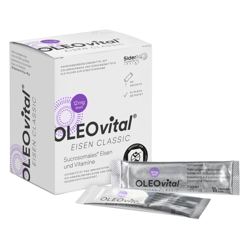 OLEOvital® EISEN CLASSIC ist ein Nahrungsergänzungsmittel mit 12 mg Eisen pro Einzeldosis und kombinierten B-Vitaminen. Durch die einzigartige Formulierung wird das Eisen erst in der Leber freigesetzt, wodurch Reizungen im Magen und Darm vermieden werden.