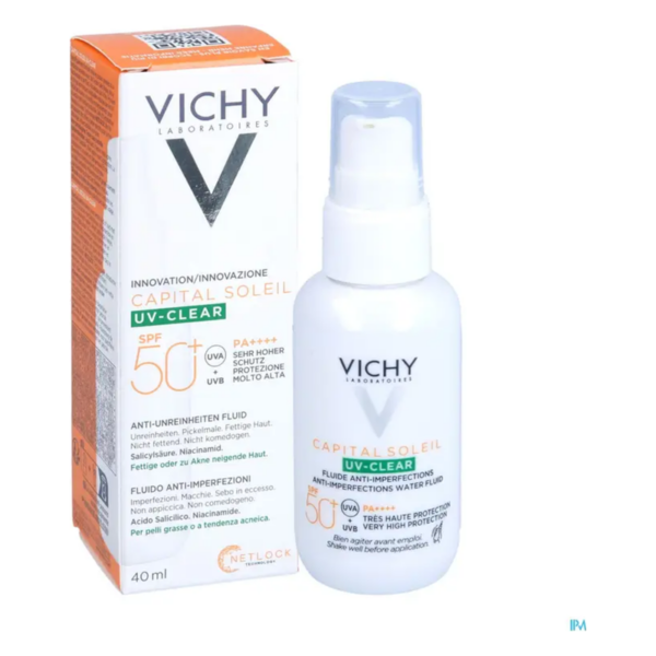 Tägliche UV-Strahlung kann Unreinheiten, Hautausschläge und Pigmentflecken verstärken. Der korrigierende Sonnenschutz CAPITAL SOLEIL UV-CLEAR basiert auf Netlock, einer Technologie, die auf dem Emulsionsprinzip beruht: UV-Filter sind in Gel-Mikrotröpfchen eingeschlossen, die nach dem Auftragen auf die Haut einen ultradünnen, gleichmäßigen und widerstandsfähigen Schutzfilm bilden. Außerdem ist es mit Salicylsäure und Niacinamiden angereichert und schützt die Haut vor UV-Strahlen und wirkt gegen Unreinheiten.